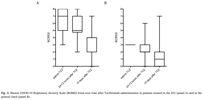 Figure 2. Changes in Brescia COVID-19 Respiratory Severity Scale (BCRSS) among 100 severe COVID-19 patients in Brescia, Italy during 10-day follow-up after Tocilizumab (TCZ) infusion